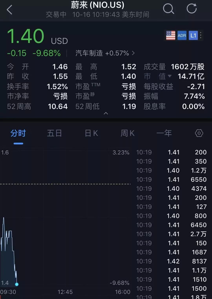 这已经不是蔚来第一次闪崩,在过去不久的国庆前后,从9月23日起,分别跌10.53%、跌20.22%、跌5.53%、跌4.39%、跌10.71%、跌10.86%,而10月1日晚间,美股开盘之后,蔚来汽车还是继续崩了,最高跌超20%。短短几个交易日就直接腰斩,跌到了1.3美元/股,累计跌幅56%。