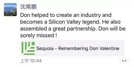红杉资本全球执行合伙人、红杉资本中国基金创始及执行合伙人沈南鹏朋友圈悼念:“Don helped to create an industry and becomes a Silicon Valley legend。He also assembled a great partnership。Don will be sorely missed! ”(唐·瓦伦丁协助创立了一个行业,并成为硅谷的传奇人物。他建立了良好的合作关系,唐将被深切怀念!)