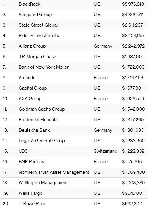 2018年,AUM超1万亿美元的全球资产管理公司还包括富达投资、安联集团、摩根大通、纽约梅隆、东方汇理、美国资本集团、安盛集团、高盛、保德信、德意志银行、英国法通集团(L&G)、瑞银、巴黎巴银行(BNP Paribas)、北方信托和惠灵顿。另外,富国银行和T. Rowe Price亦跻身前20位,资产均在9600亿美元以上,相当接近1万亿美元大关。
