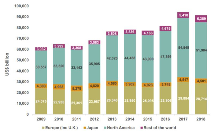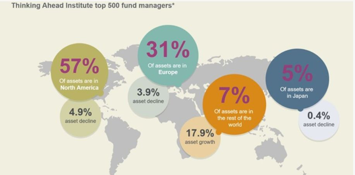 Thinking ahead institute与《养老金与投资》一起合作推出的2019年度全球资管500强报告显示,排名前500位的全球资产管理公司的可管理资产总额(AUM)2018年底为91.5万亿美元,较上年底下降3%,北美、欧洲和日本等传统发达市场均出现下滑。