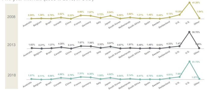 从各国的变化来看,美国作为全球领先的资管市场,其份额仍在提高,10年里提高了逾10个百分点;而英国、西班牙、意大利、德国、日本等国家的份额有较为明显的下降;其中英国的份额竟然下降了近3个百分点,从2008年的10.5%下降至7.58%;日本的份额亦由8.04%降至4.92%。