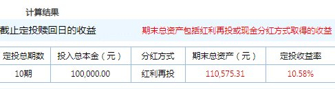 同样的,假设从2018年11月1日开始进行按月定投,一共定投10期,投入本金10万元,收益是10575.31元,定投收益率为10.58%,比按周定投的方式高0.61个百分点,实际差距并不大。