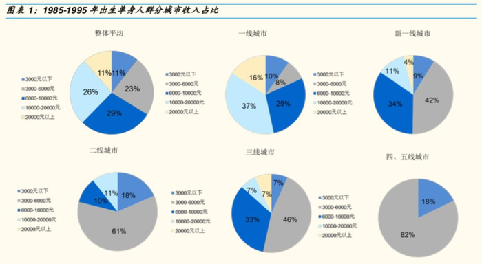 国金证券的报告显示,半数以上的单身青年集中在一线和新一线城市,其中互联网、汽车和房产行业是单身重镇。在一线、新一线、二线城市的单身青年,有40%是月光一族。总体85年至95年出生的单身人群中,52%的人群月收入在3,000~10,000元,新一线城市往下,部分单身青年的月度可支配收入在 2,000 到 5,000 元之间。