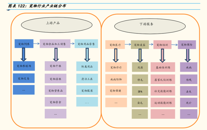 宠物行业经过多年的发展,已经形成了一个完整的产业产业链,覆盖宠物从生到死的全过程,上游包括宠护饲养、食品、日用品,下游有宠物医疗、美容、培训和保险等板块,其中宠物食品和宠物医疗是最大的两个板块。