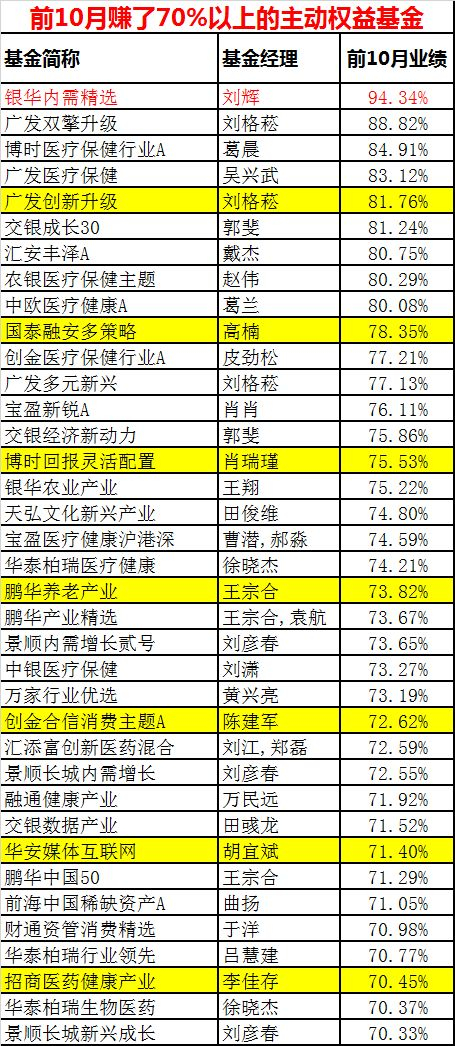 先看看今年前10个月基金整体业绩情况,上证指数涨幅为17.45%,投资A股的主动股票型基金赚了36.73%,偏股混合型基金赚了35.94%,同期沪深300指数的表现为29.1%。