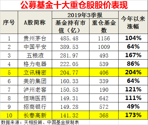 只要看一下公募基金2019年三季度末的十大重仓股涨幅,你可能就对为什么今年“炒股不如买基金”有切身的体会了。