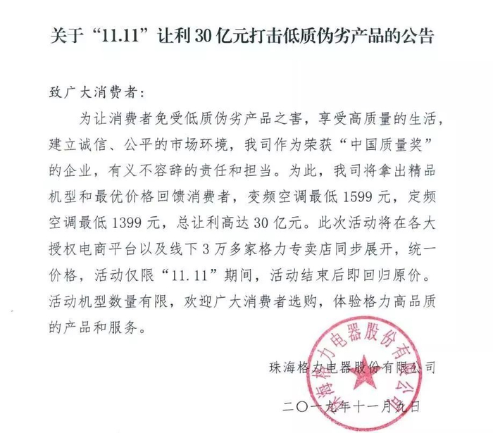 11月10日,格力电器官微公告,格力电器“11.11”期间让利30亿元,打击低质伪劣产品,变频空调、定频空调最低价分别至1599、1399元。