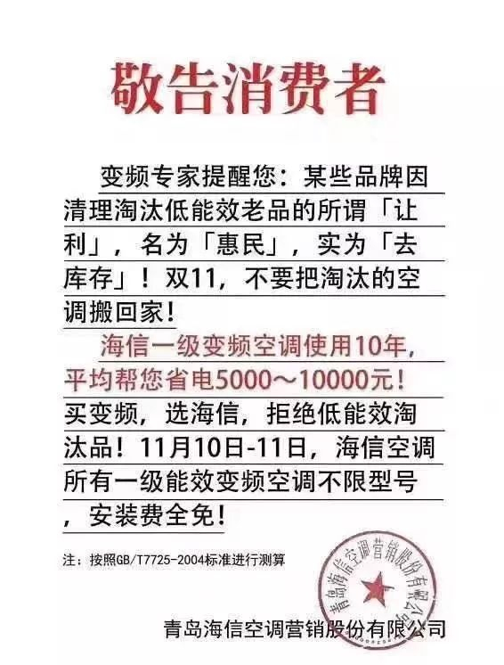 海信空调也急了,提醒消费者某品牌为了淘汰低能效老品。
