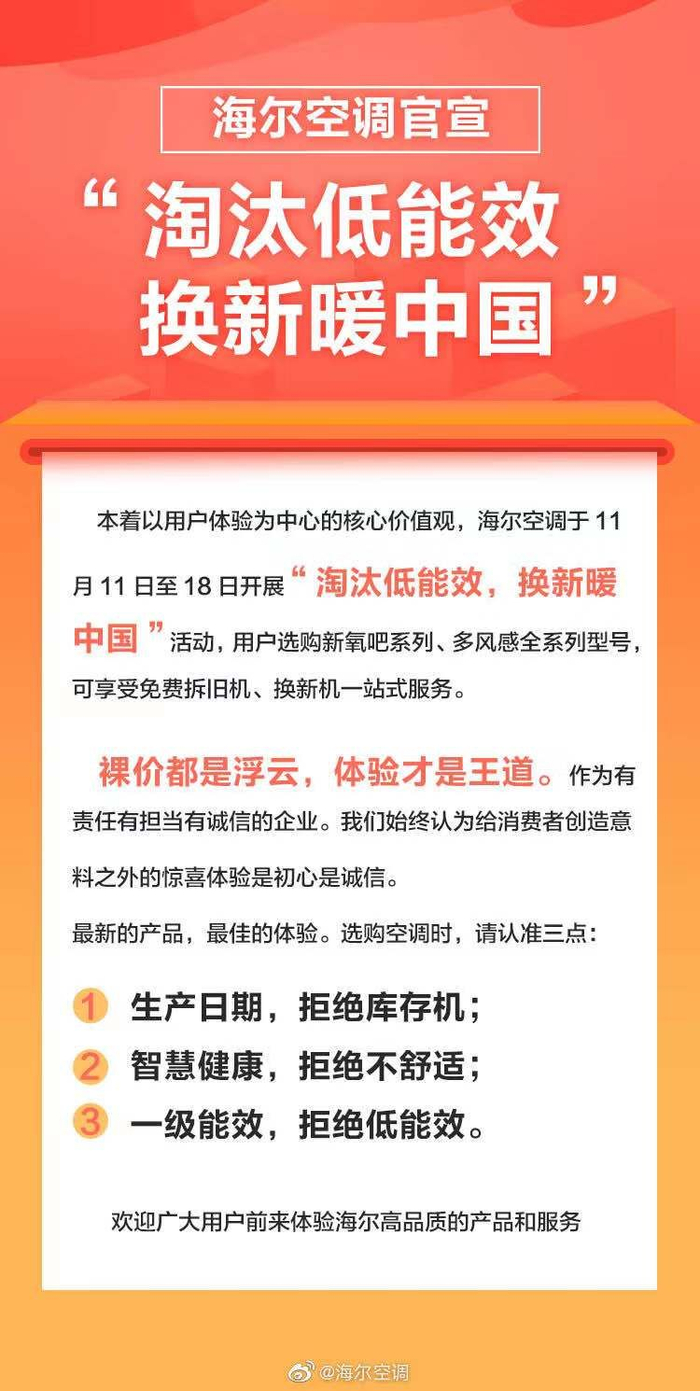 11月10日,海尔空调也提醒消费者,选购空调时要“认准生产日期,拒绝库存机”。海报中更是暗示某品牌降价是为了淘汰6-7年的老产品。