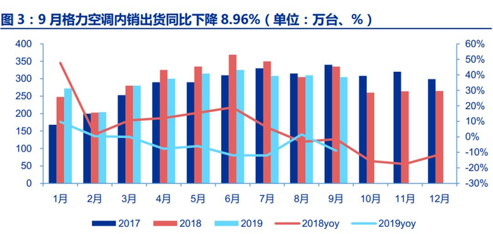 据申万宏源家电分析师的研报,截至 9 月份格力、美的、海尔、奥克斯内销增速分别为-8.96%、52%、40%和 42.86%,其中格力 5-9月连续三个月内销出货下滑,控制出货意图明显。