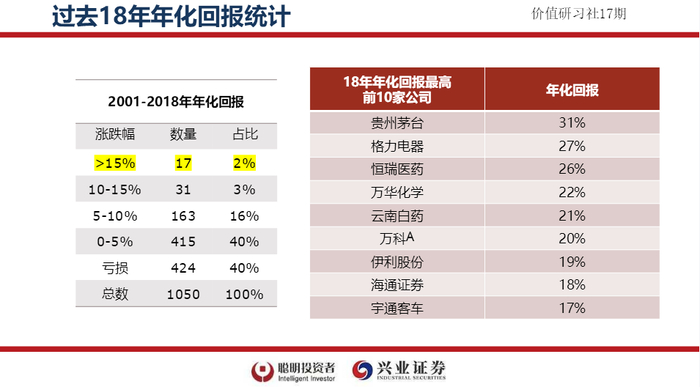 在2001年已经上市的1050家公司里面,到2018年,18年年化回报超过15%的企业,大概只有2%,18年年化回报10%到15%的有31家,大概占3%。