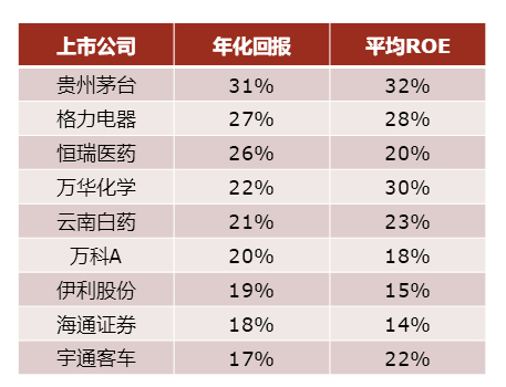 我们统计了过去18年股价表现最好的10个企业的过去18年平均ROE(净资产收益率),一眼可以看出最典型的特征,它们的平均ROE都非常高。