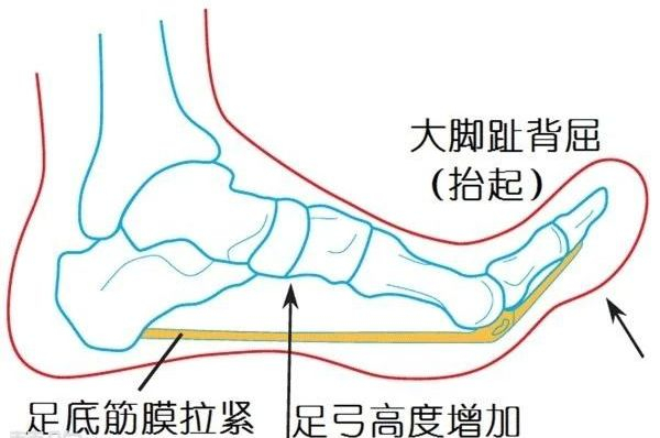 有了这样的设计,当你穿著鞋子在站立或走路时,大部份的时间你的脚指都是上提、离开地面的。使得脚指处在处于延展的位置 (Extneded Position) ,或说是呈现「背曲 (Dorsiflextion) 」的状态。因为如此,脚指只有在脚跟抬起时才会接触地面。