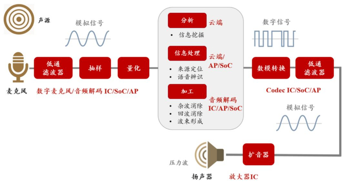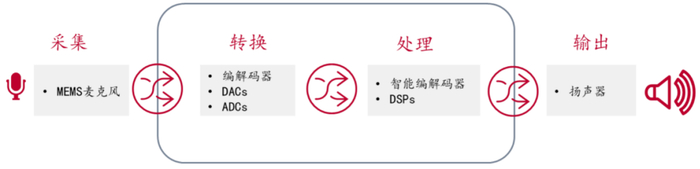 声音作为自然界模拟信号的一种,是信息设备功能配置不可或缺的一环。电子产品为了完成音频的交互,其完整的声学系统包含三部分:①采集,主要由麦克风来实现。②处理,由各类音频IC或云端来实现,如ADC、DAC、音频编码器/解码器等。③播放,主要由音频放大器(属于音频IC)、扬声器来实现。其中最主要的元器件分别是麦克风、扬声器与音频IC。