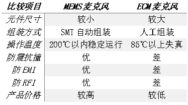 MEMS与ECM均是电容式结构,原理类似,只不过MEMS麦克风采用了半导体制程的芯片结构,由一个MEMS芯片与一个ASIC专用集成芯片构成。与ECM相比,MEMS麦克风尺寸较小、灵敏度高、信噪比高,有着良好的RF及EMI抑制功能,同时与数字信号处理电路有着较好的适应性。制造方面,MEMS麦克风可以采用全自动SMT封装生产,效率大为提升,因此逐步替代ECM,在消费电子小型化浪潮下,成为行业主流。