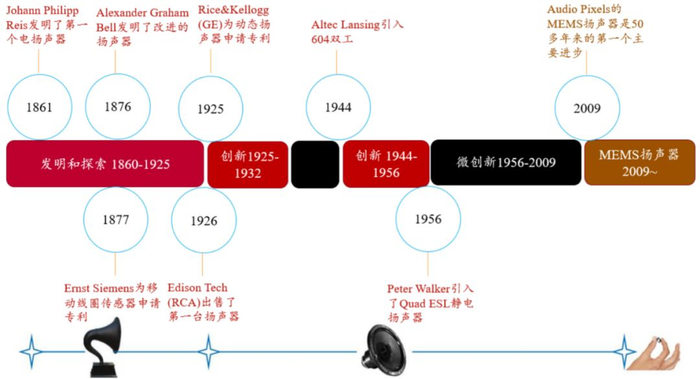 扬声器是声音传输的最后环节,也是音频系统最早被发明的环节。早在1860年代,第一个电扬声器就已经问世;到1950年代,扬声器结构基本稳定;进入2010年代,利用MEMS技术制造的扬声器开始被行业关注。