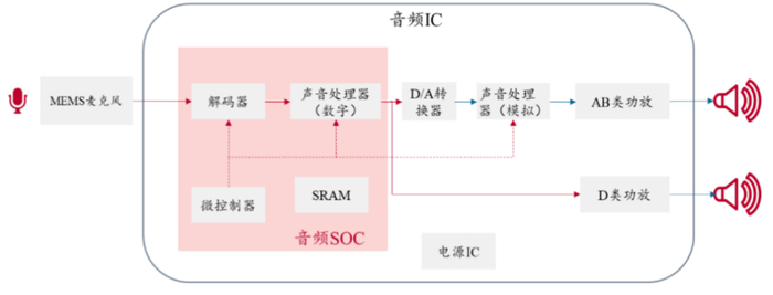 在麦克风与扬声器之间,音频IC(编/解码器、接口IC、功放IC等)扮演关键角色。音频ICDAC、ADC、DSP、Codec等,涵盖模拟芯片、数字芯片及数模混合芯片,技术含量较高。音频IC功能在于音频模拟信号的读取与解调、模拟与数字信号之间的转换、音量与音质的调整等。早期模拟音频时代(1970s之前),音频IC以模拟IC为主,主要是音频放大器与AB类功放;往后数字音频时代(1980s-1990s),伴随大规模集成电路的发展,音频IC也逐步增加数字化芯片,如数字声音处理器、D类功放;到2000年之后的多媒体与高解析音频时代,数模混合IC、更复杂的DSP、DAC集成、更高分辨率的声音处理器使得音频IC市场更为丰富与繁杂。