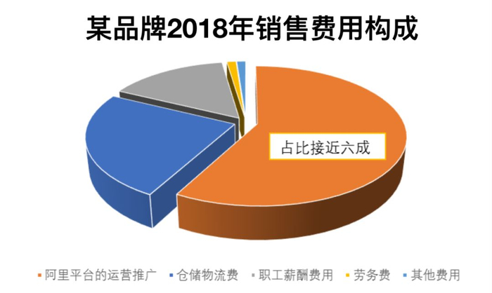 品牌的销售成本包括两块费用。一是销售费用,占比15%,用于产品给消费者的降价折扣;二是行销费用占比15%,用于购买广告流量及赠品发放等。这两块费用一般都是直接打包进入品牌商的年度预算框架内。