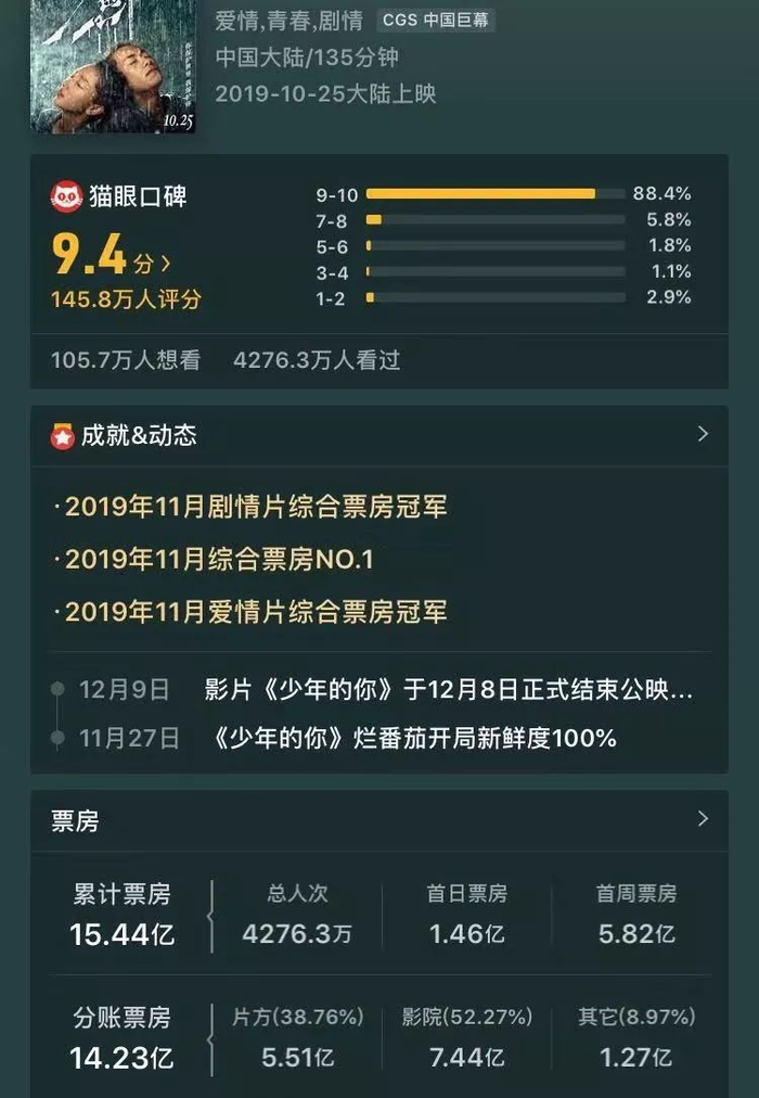 与此同时,根据猫眼专业版数据显示,在扣除了电影事业发展专项基金、营业税金及附加费用后,《少年的你》可分账票房为14.23亿,其中片方占38.76%,分账5.51亿,影院占52.27%,分账7.44亿;其他占8.97%,分账1.27亿。如果按媒体报道的1.2亿成本计算,该片的投资回报率高达359%。