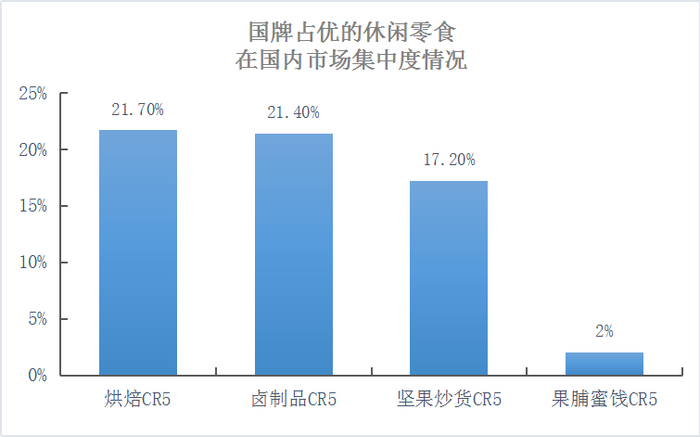 在国内零食市场,外资品牌主导的西式零食(巧克力、糖果、饼干、薯片)行业集中度较高,坚果、卤制品、烘焙、果脯蜜饯等休闲零食市场份额始终由国内厂商把持,且行业集中度较为分散。坚果炒货的CR5仅17.2%,休闲卤制品的CR5为21.4%(来源:Frost & Sullivan,注:CR是指行业前N大企业产出占比)。