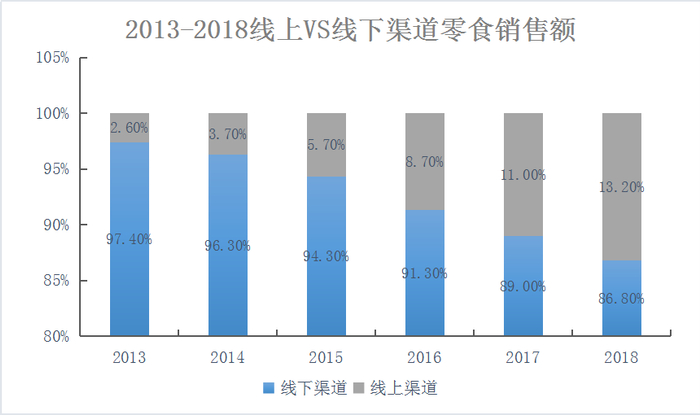 近年来,随着电商网红品牌的崛起,零食的线上销量快速提升,虽然以商超、卖场、连锁店为主的线下销售仍占主导,在电商平台的导流优势下,线上渠道的增长迅速,占零食总销售额的比例也持续上升。