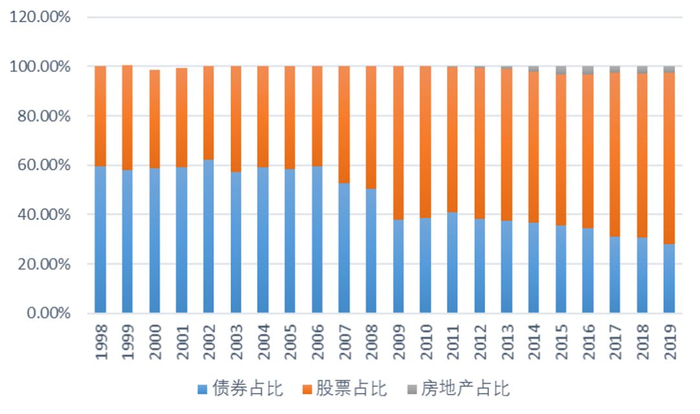 在大类资产配置方面,截至2018年底,GPFG的投资涉及全球73个国家和50种货币,投资范围覆盖权益资产、固定收益资产及房地产资产。GPFG在成立之初主要投资于固定收益类资产,1998年NBIM正式制定了将60%的基金投资于固定收益资产、40%的基金投资于权益类资产的战略资产配置目标,并规定在权益投资比例偏离超过4%时对组合进行再平衡。2008年,GPFG在全球金融危机中损失惨重,但NBIM仍然按照股灾前的决策将2009年的战略资产配置目标调整为60%的权益资产+40%的固定收益资产,并严格执行了再平衡操作,这为GPFG在2009年获得优异的投资回报奠定了基础。2011年,NBIM将房地产资产纳入投资范围。下图展示了1998年以来GPFG的战略资产配置情况。
