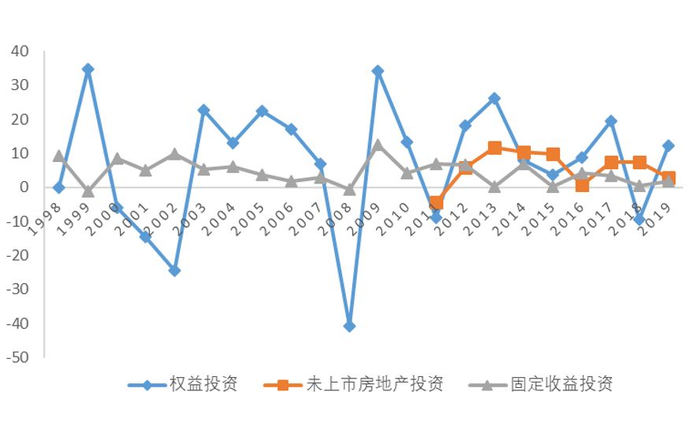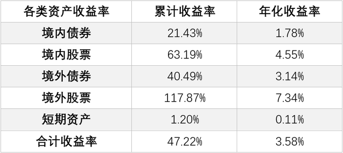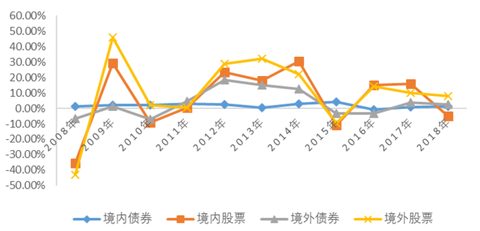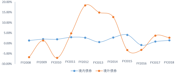 从各类资产绝对收益率来看,境外股票资产表现最优。下图展示了2008财年以来,各类资产的收益率情况。