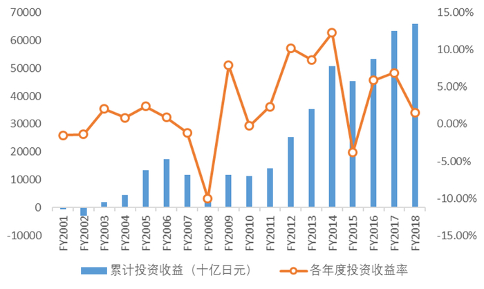 投资收益方面,成立之初,集中投资日本境内债券市场的GPIF表现较为平庸,近年来随着其投资的国际化和分散化,业绩也在逐步提升。截至2018财年,GPIF累计录得投资收益65.82万亿日元,年化收益率3.03%。最近十年(2009-2018)累计收益率63.64%,年化收益率达到5.05%。
