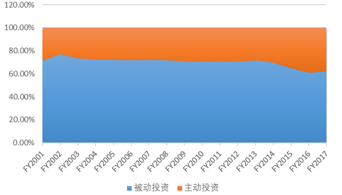 在投资策略上,GPIF将境外债券投资分为主动投资部分和被动投资部分。截至2017财年,被动投资部分市值为14.8万亿日元,占比为61.98%,主动投资市值为9.09万亿日元,占比38.02%。从时间序列来看,被动投资占比始终在60%以上,近年来主动投资的占比略有提升。