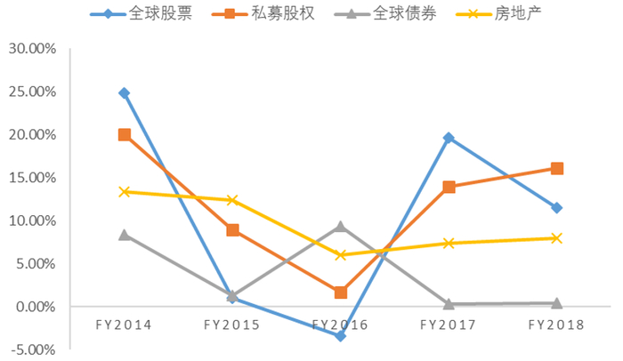 其中,2014财年以来,私募股权最为亮眼,累计收益达到75.75%,年化收益为11.94%,全球股票累计收益为62.37%,年化收益率10.18%,其次为房地产资产,累计收益56.72%,年化收益9.4%,全球债券累计投资收益为20.75%,年化收益3.94%。下图展示了各类资产历年投资收益率。