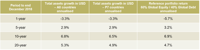 表2统计了最近1年、5年、10年、20年全球和P7养老金市场规模增速以及全球公开市场投资基准(60%全球股票+40%全球债券)的业绩增速。在2018年,养老金市场规模下降的幅度小于基准;而从中长期视角看,养老金市场的规模增速与全球公开市场增速相近。
