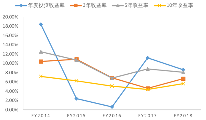 在投资回报方面,2018财年PERF实现了8.6%的投资收益率,过去三年、五年、十年的年化收益率分别为6.7%、8.1%、5.6%。下图展示了2014财年以来的投资收益率情况。