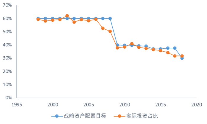 整体来看,GPFG在固定收益资产上的配置比例呈现逐步下降的趋势,1998年以来的固定收益资产配置目标及实际投资比例如下图所示。