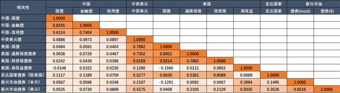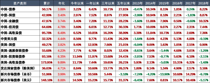 注:[1] 资产类别与相应指数的对应关系如下:中国债券-中债综合财富指数;中国国债-中债国债总财富指数;中国金融债-中债金融债总财富指数;中国金融债-中债金融债总财富指数;中国高收益债-中债高收益企业债总财富指数;中资美元债-巴克莱中资美元债指数;美国国债-美国国债总指数;美国通胀保值债券-美国通胀保值债券指数;美国投资级债券-美国投资级债券指数;美国高收益债券-美国高收益债券指数;发达国家债券(除美国)-发达国家债券(除美国)指数;新兴市场债券(本币)-新兴市场债券(本币)指数;新兴市场债券(美元)-新兴市场债券(美元)指数。