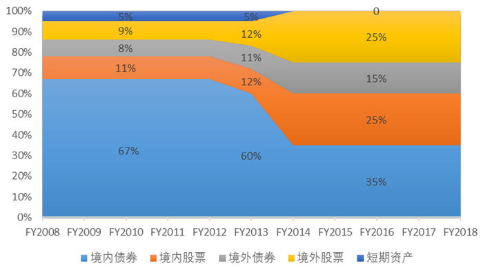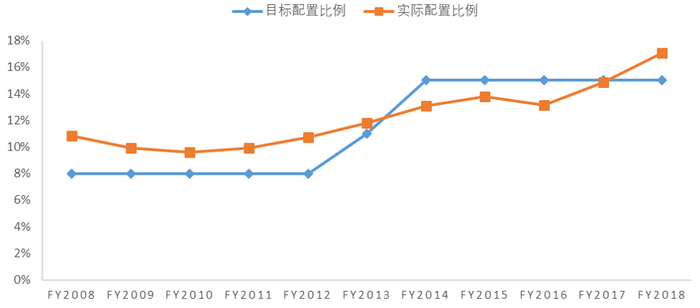 在资产配置方面,GPIF成立之初投资风格保守,以境内债券为主要投资标的。直到2012财年结束,境内债券的投资比例仍然高达60%,过度集中于本国债券的投资隐藏了较大的系统性风险,因此从2013财年开始,GPIF逐步调整了资产配置目标:下调境内债券配置比例、提升境内股票、境外债券及境外股票的配置比例。截至2019年3月底,GPIF在境内债券、境内股票、境外债券、境外股票上的配置目标比例分别为:35%、25%、15%、25%。下图展示了2008财年以来GPIF各类资产的配置目标比例。