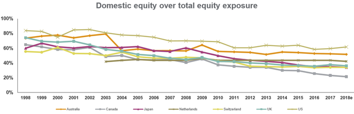 此外,Towers Watson还统计了P7养老金股票和债券配置于境内市场的比例,如图2和图3所示。平均来看,境内股票资产占比从1998年的68.7%下降到了2018年的40.2%;在过去10年,美国养老金投资于境内股票市场的占比最高,而加拿大、瑞士和英国投资于境内股票市场的占比最低。境内债券资产占比从1998年的86.3%下降到了2018年的70.9%,荷兰、英国和美国投资于境内债券市场的占比最高,而瑞士投资于境内债券市场的占比最低。由此可见,不管是股票投资还是债券投资,全球各大养老金市场都在逐步增加境外投资的比例。