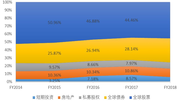 在大类资产配置方面,PERF有效地实现了投资的多元化,通过配置全球股票、私募股权、全球债券[7]、房地产、短期流动性资产、通货膨胀挂钩资产及多元资产组合来获取长期、稳健的投资回报。下图展示了2014财年以来PERF在各类资产上的年度资产配置目标,可以看到全球债券的配置比例在不断提升。