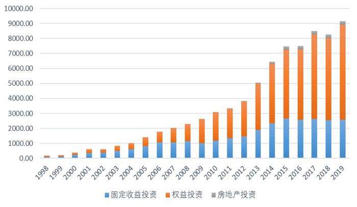 在实际投资中,NBIM对各类资产的投资均严格执行了战略资产配置的要求及再平衡策略,截至2018年底,GPFG投资于权益资产、固定收益资产、房地产资产的比例分别为30.68%、66.34%、2.98%。下图展示了1998年以来,各类资产的投资规模和占比。