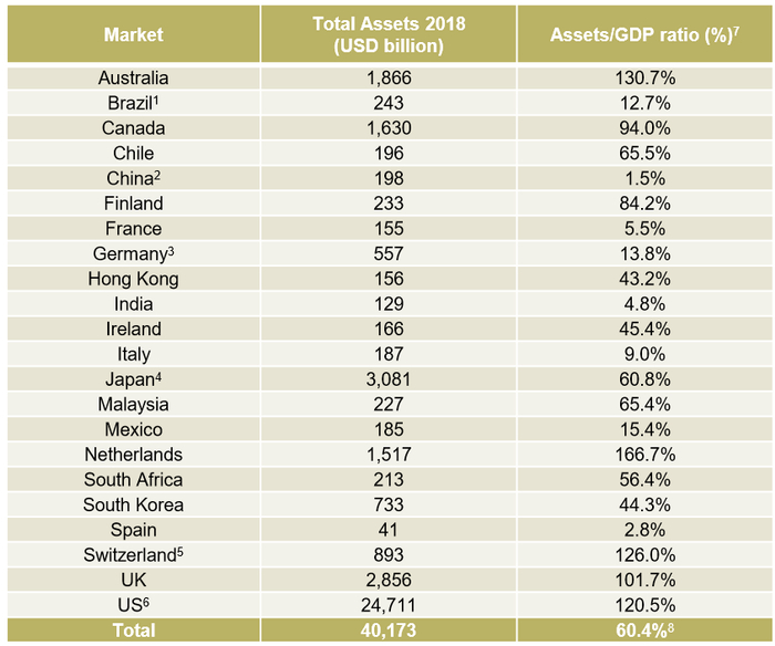 根据Towers Watson 2019年2月发布的最新全球养老金市场研究(Global Pension Assets Study 2019),2018年全球前22大养老金市场(P22)合计管理规模40.17万亿美元,同比下降3.3%,主要原因来自于国际经济形势、股市以及汇率波动等负面影响,但私募股权等非公开市场资产的配置对这些负面影响进行了对冲,一定程度上减缓了资产缩水的规模。