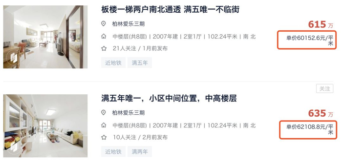 但是同地段的二手房呢?我们拿对面的老小区柏林爱乐来讲,是2008年交付,开盘价是5800元/平米,2010年房价是1.5万/平米,现在房价是多少?6万/平米,升值3倍多。