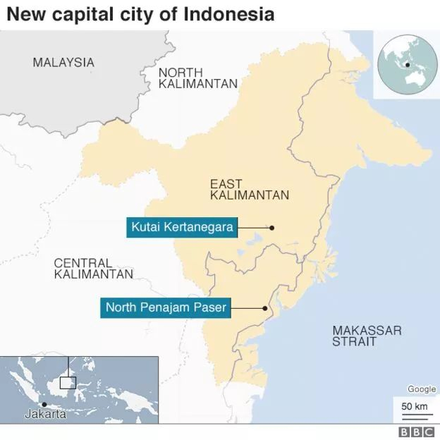 (图为印尼新首都位置,左下角小图中标注了现首都雅加达与新都的相对位置)