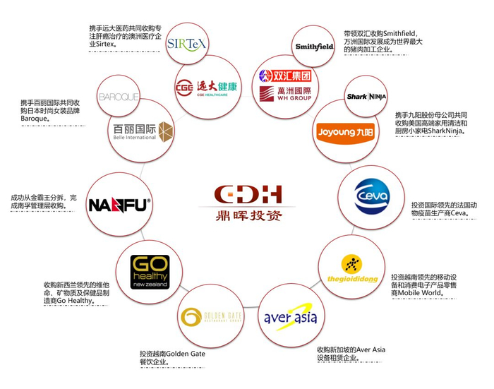 自2013年至今,鼎晖PE投资团队共操盘了10个跨境并购项目,项目总规模(收购时标的公司企业价值)超过100亿美元。其中,联合产业资本共同完成的跨境并购项目包括:美国的Smithfield(史密斯菲尔德)及SharkNinja电器、日本的Baroque女装品牌、澳大利亚的Sirtex医疗。其他由鼎晖投资独立操刀完成的跨境并购及投资项目则包括:新西兰的GO Healthy健康品牌、越南的Mobile World 手机连锁店及Golden Gate餐饮、法国的Ceva Santé Animale动物医药、新加坡的Aver Asia设备租赁,以及从美国宝洁收购的南孚电池;此外,鼎晖VGC投资团队也曾携手中国领先的工业机器人制造商埃夫特,收购意大利机器人系统集成商W.F.C集团。