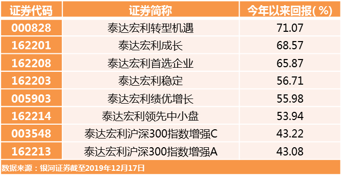 7.泰达宏利沪深300指数增强A由泰达宏利中证财富大盘基金转型而来,转型业绩为114.32%,同期业绩比较基准为56.23%,转型日2018年3月16日,2019年上半年的业绩为30.15%,同期业绩比较基准为25.66%。