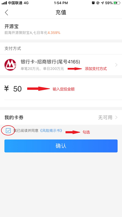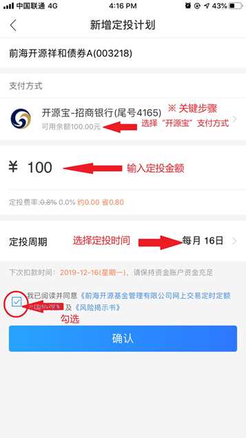 四、点击右下角“定投”——选择支付方式“开源宝-**银行”,输入具体的买入金额,定投周期可勾选“每周、每双周、每月时间具体时间节点”定投——勾选“我已阅读并同意《风险提示书》”——选择点击“确认”。