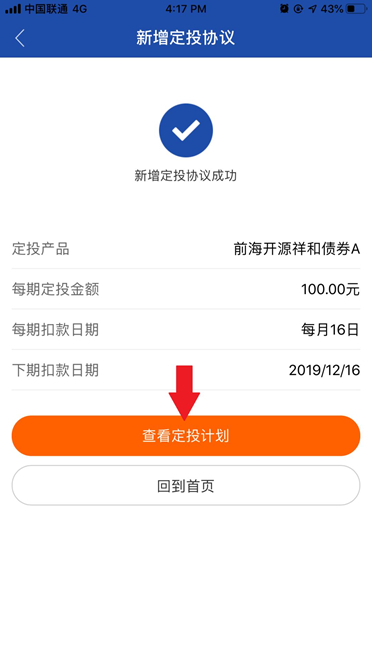 五、输入交易密码——新增定投协议成功。点击“查看定投计划”可以查到该笔交易的申请情况。定投成功之后系统根据定投日期自动从开源宝账户内划出定投金额用于申购该款基金产品。