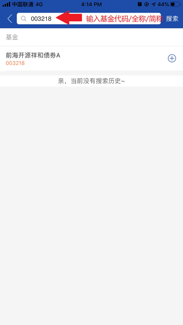 三、回到主页,点击“基金”—点击右上角“查询键”—输入基金代码或者基金简/全称。举例:输入00****找到“前海开源****”。