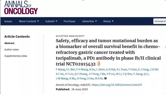 中山大学肿瘤防治中心徐瑞华教授牵头国内多中心多队列CT-5的Ⅰb/II期临床研究(NCT02915432),本次报道了晚期胃癌人群中的研究结果,包括特瑞普利单抗用于治疗标准失败的晚期胃癌及联合XELOX方案一线治疗两个队列。后线治疗组共入组58名患者,整体人群ORR为12.1%,与国际同类药物疗效相当。 首次在国际上提出TMB在晚期胃癌PD-1单药治疗的生存获益预测价值。研究发表在国际权威肿瘤杂志Annals of Oncology,首次证实国产PD-1单抗拓益对晚期胃癌安全有效。