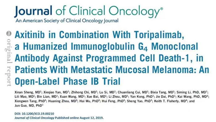 2019年8月12日,北京大学肿瘤医院郭军教授团队开展的特瑞普利单抗联合阿昔替尼治疗晚期黏膜型黑色素瘤的研究(NCT03086174)结果在线发表于《临床肿瘤学杂志》。该项全球首个抗PD-1单抗联合VEGFR抑制剂治疗晚期黏膜黑色素瘤研究结果显示,特瑞普利单抗联合阿昔替尼治疗未接受过化疗的晚期黏膜黑色素瘤患者可获得48.3%的ORR及86.2%的DCR,中位PFS达7.5个月,中位OS尚未成熟。该研究分析结果及未成熟的OS数据显示,特瑞普利单抗联合阿昔替尼治疗晚期黏膜黑色素瘤是一种颇具前景的选择方案。