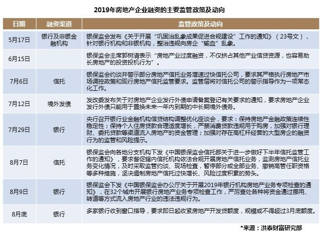 融资“暖春”持续到2019年4月,监管层认为房地产企业过度融资,挤占了其他产业、小微企业的信贷资源。5月至8月,政府出台多项政策收紧房地产企业融资,从信托、境外发债以及开发贷等多方面融资渠道进行严控。