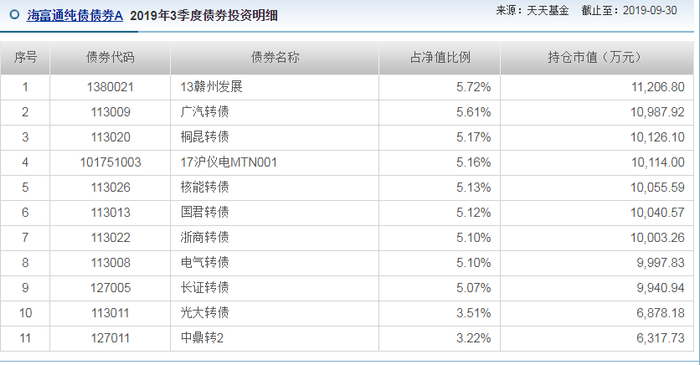 它是债,但我觉得它不够纯。下图是海富通纯债债券基金的债券持仓: